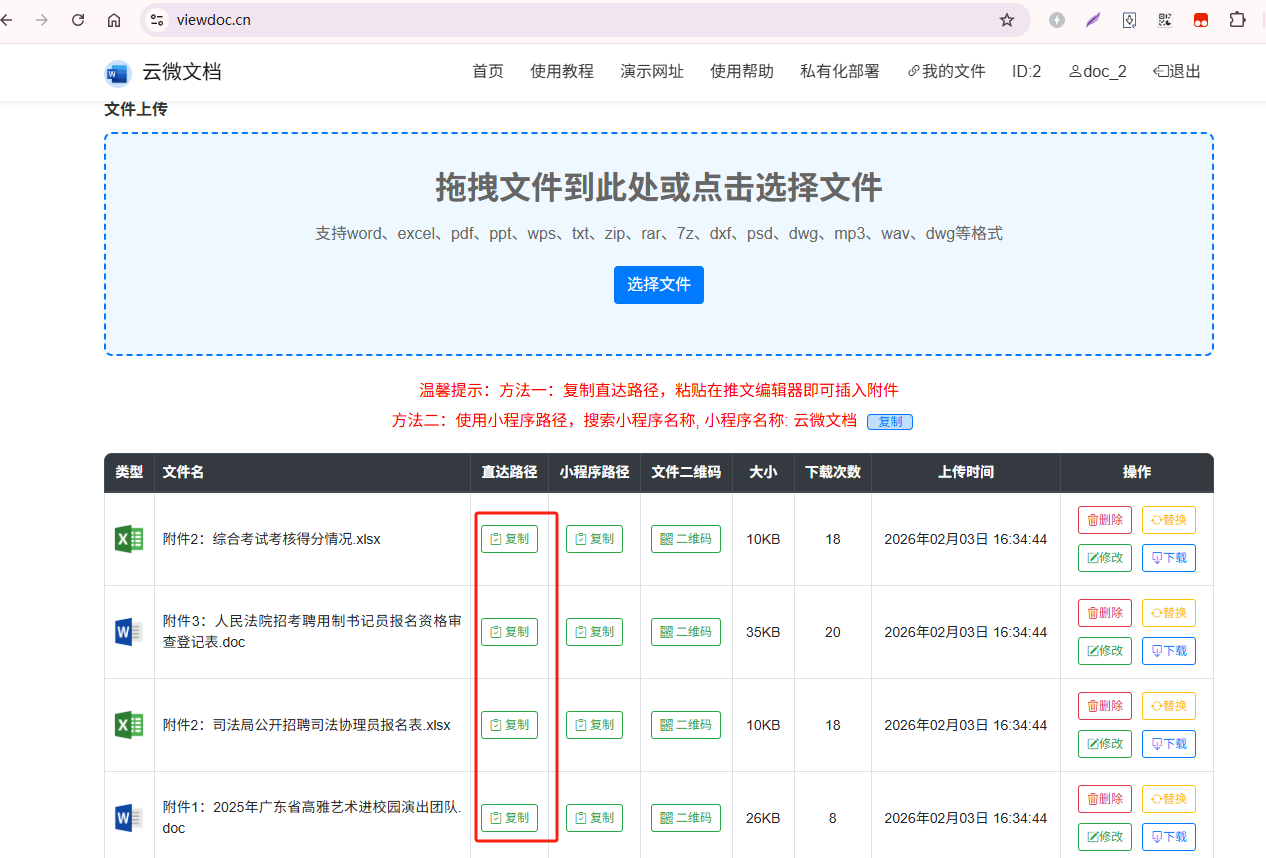 老牌公众号文章附件工具,超百万用户,长期稳定,上传速度和下载极快,免费无须注册,有电脑端和小程序端,支持批量上传,支持文档重命名,文档替换,二维码,直达链接,小程序链接等多种方式插件到公众号文章。