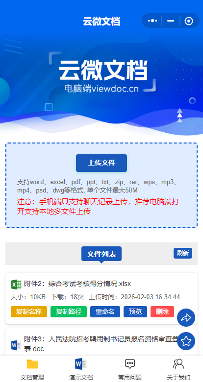 Word、Excel、PPT、PDF、WPS、TXT 这些办公文档不在话下,连 ZIP、RAR 压缩包、MP3 音频、PSD 设计图、CAD 工程文件都能传。单个文件最大 50M,日常发公告、放资料够用了。